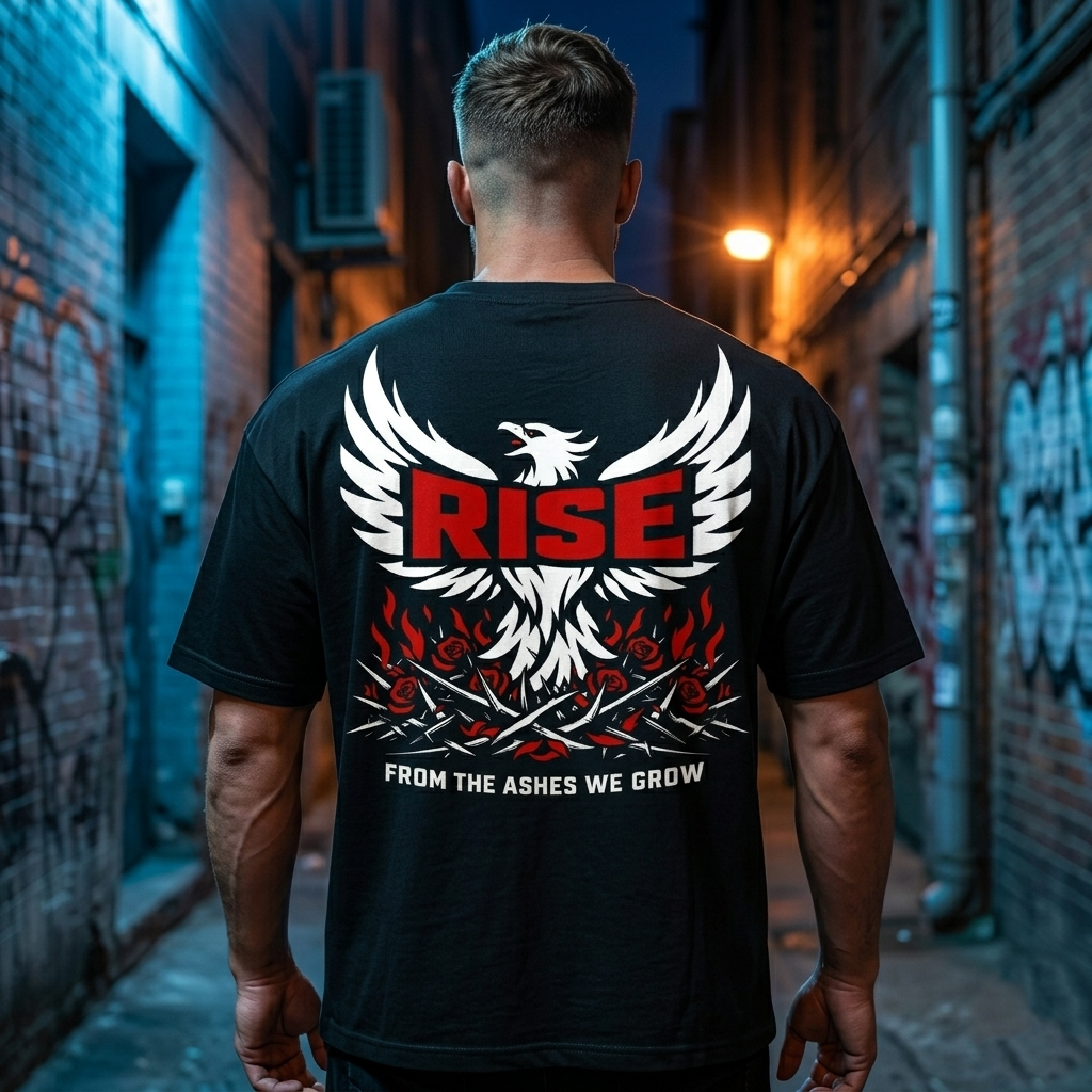 Trendy Design: Bold “RISE From The Ashes” graphic on the back for a stylish look.